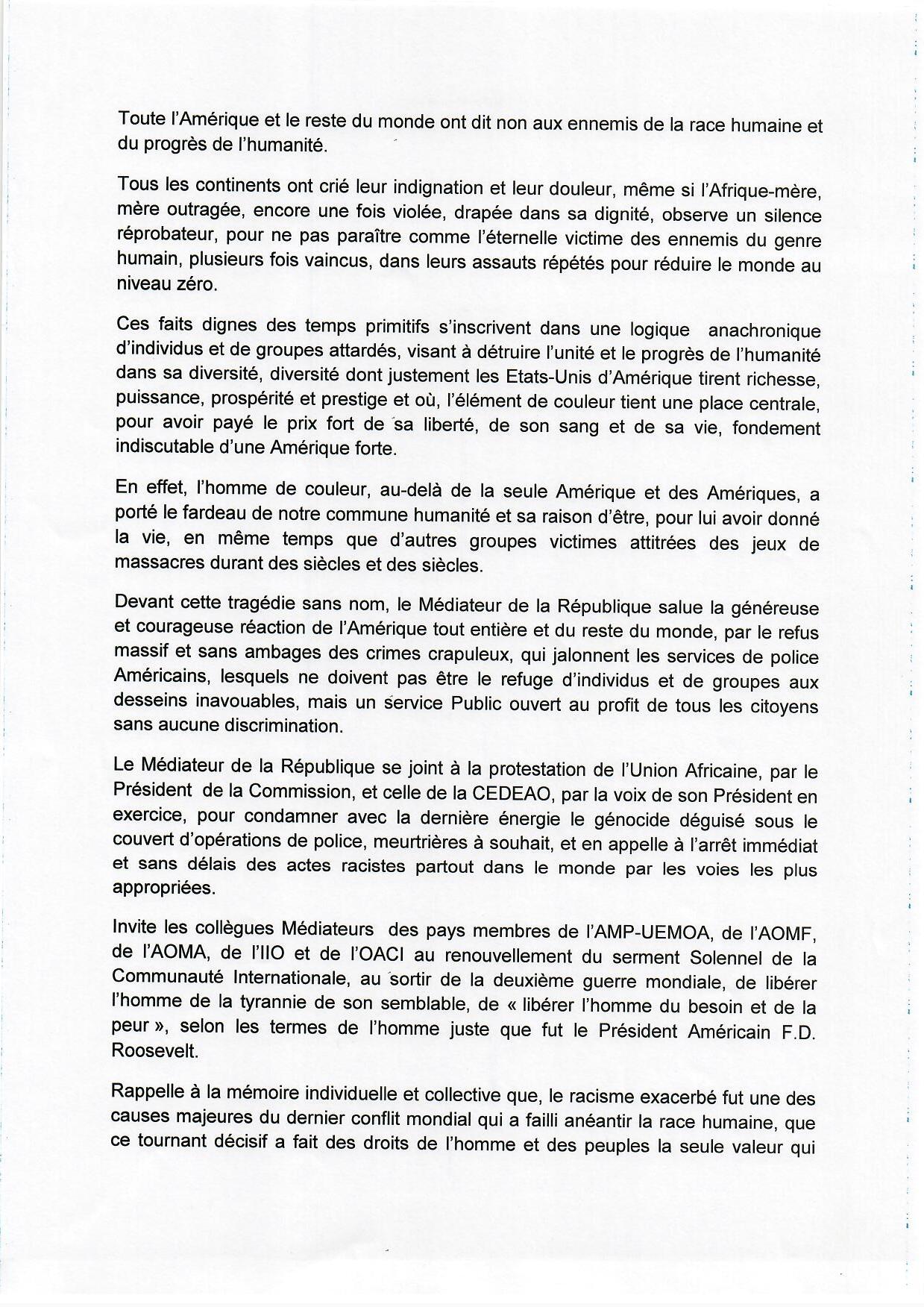 Déclaration du Médiateur de la République suite à l'assassinat de Georges Floyd Détails Catégorie : Non catégorisé Date de Publication : 2020-06-26 12:05:22 Publier par : Madame Abdoul Aziz Fati