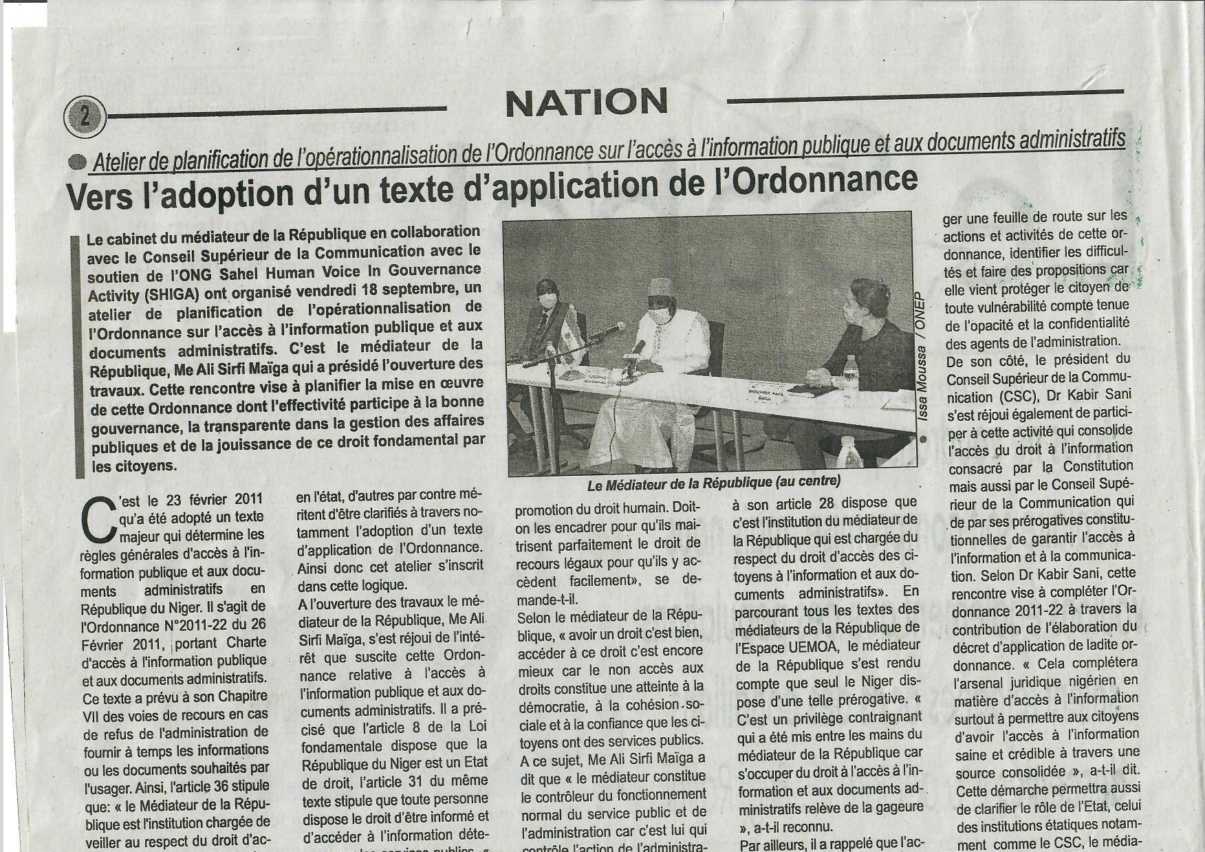 le cabinet du médiateur de la République en collaboration avec le Conseil Supérieur de la communication avec le soutien de l'ONG Sahel Human Voice In Gouvernance Activity (SHIGA) ont organisé vendredi 18 septembre, un atelier de planification de l'opérationalisation de l'ordonnance sur l'accès à l'information publique et aux documents administratifs. C'est le médiateur de la République, Me Ali Sirfi Maïga qui a présidé l'ouverture des travaux. Cette rencontre vise à planifier la mise en oeuvre de cette Ordonnance dont l'effectivité participe à la bonne gouvernance, la transparente dans la gestion des affaires publiques et de la jouissance de ce droit fondamental par les citoyens